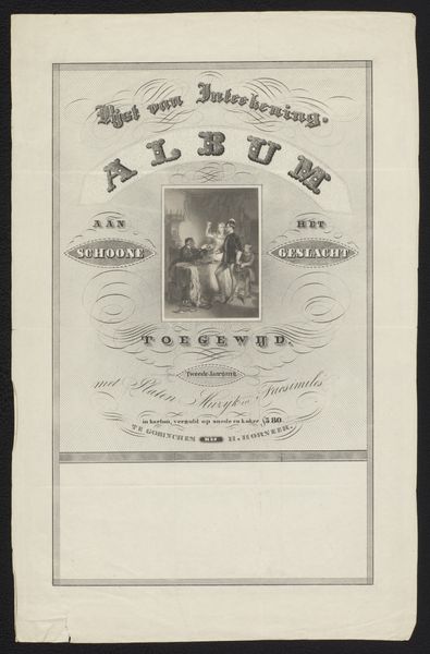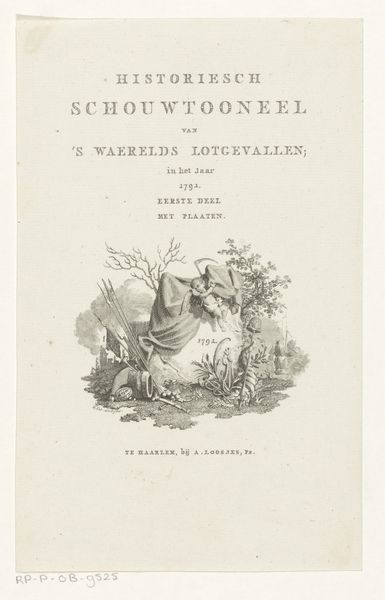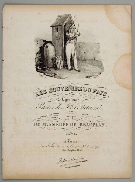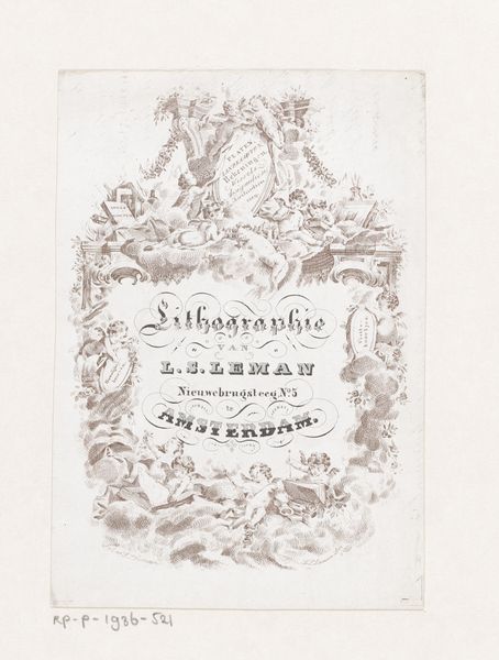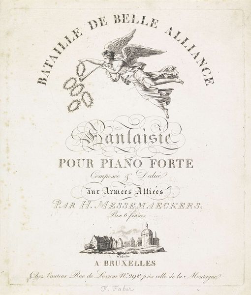 This is the cover for eight prints with memories of the French army, created in 1830 by Victor Adam. The work invites us into a world of faded grandeur, dominated by a muted blue tone that washes over the paper, lending the piece a melancholic, almost dreamlike quality. The lettering, ornate and flowing, captures a sense of history. The central vignette, depicting soldiers amidst what appears to be a war-torn landscape, uses stark contrast and detailed line work, drawing our eye to the human element amidst conflict. It evokes the romanticism of war, reminiscent of Jacques Derrida's concept of différance, the deferral and difference in meaning where the image hints at the glory and the grit of military life. Adam uses the formal qualities of lithography to question fixed ideas about war and memory. The monochromatic palette unifies the visual elements and encourages contemplation on how we construct narratives of the past. In essence, the artwork functions as a semiotic artifact, where each formal element—line, text, and composition—contributes to a rich discourse on history.