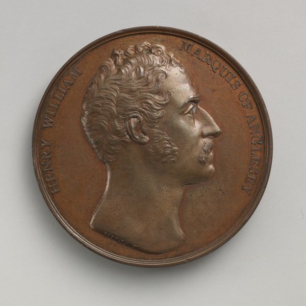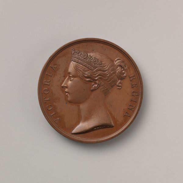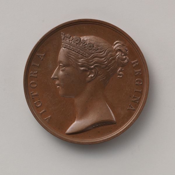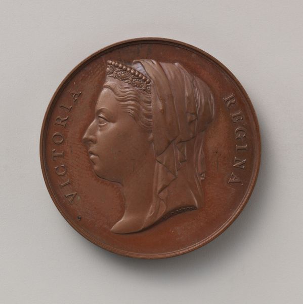 This bronze medal, created by William Wyon around 1845-46, features a profile of Queen Victoria. The circular form, typical of medals, directs our focus to the incised details: the delicate rendering of Victoria’s features, her ornate crown, and the surrounding inscription “Victoria Regina”. The design employs a classical structure, harking back to ancient Roman coinage, where the ruler’s image conveyed power and authority. Wyon uses line and relief to define Victoria’s image, the inscription serving not just as a label but as a frame, reinforcing the image's symbolic weight. The medal functions as a signifier of British power and regal authority at the height of the Empire. However, the relative modesty of the bronze material, as opposed to gold or silver, suggests a subtle shift in the understanding of power, perhaps reflecting a tension between imperial ambition and a more restrained representation of monarchy. This medal invites us to consider how even seemingly straightforward images are encoded with complex cultural and political meanings.