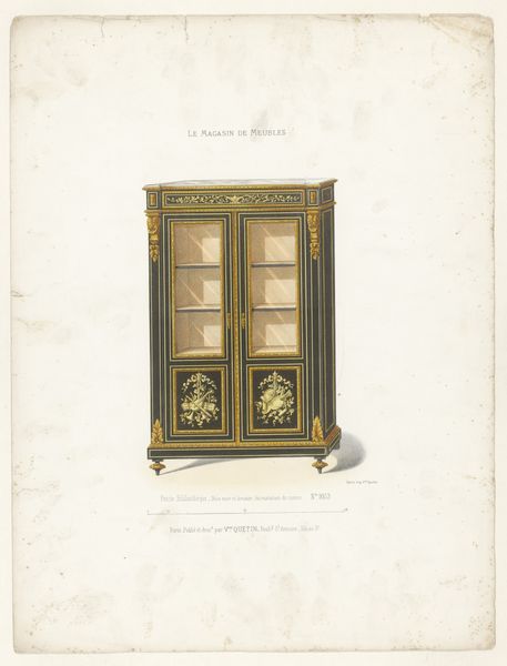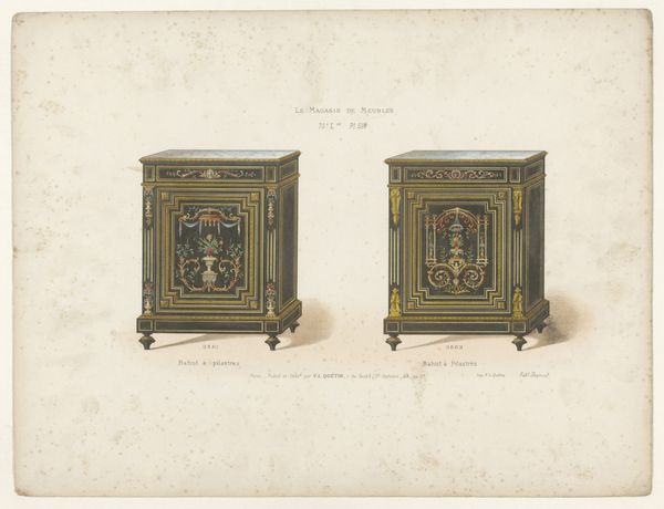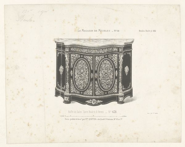 This print from an unknown maker, likely an engraving with hand-colouring, depicts a design for a small cabinet, or ‘kaste’ in Dutch. The print emerged from a Parisian furniture 'magasin,' or store. In late 18th-century France, the decorative arts became central to displays of wealth and status. Furniture design was influenced by the court of Louis XVI, known for its opulence and refinement. Here we see gilded ornamentation, classical motifs, and luxurious materials like marble, all signifiers of elite taste. The print itself served a key function in this culture: disseminating designs to a wider audience. These images fuelled consumer desire and shaped ideas of what constituted 'good' design. Examining trade catalogues and design publications from this era reveals the complex networks through which taste was manufactured and distributed. By considering the role of institutions like furniture stores and the popular press, we can understand how the visual language of luxury was constructed and consumed.