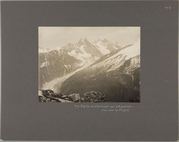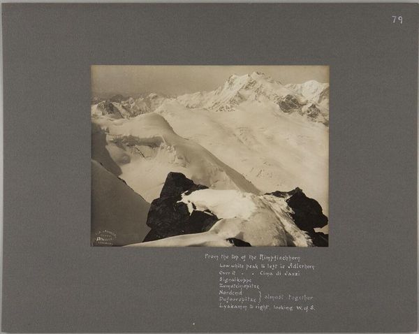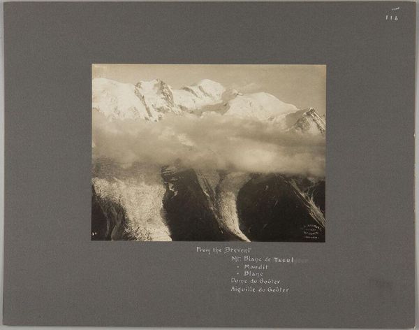Curator: Hey there! What's catching your eye today? Editor: This silver gelatin print, “A view near the top of Mont Blanc” by George Perry Ashley Abraham. It's a stark landscape, so austere, with a cool and distant mood. What strikes you about it? Curator: You know, it's like stepping into a dream, all peaks and whispers. The starkness, the monochrome… it almost feels like a memory fading at the edges. I wonder, did Abraham feel small against that grand backdrop, or emboldened? Editor: Small, probably! Though maybe both. It's humbling. Curator: Absolutely humbling. It reminds me that even the most breathtaking vistas are just fleeting moments captured in time. Thanks for pointing that out! Editor: Thanks to you too! I see it differently now.