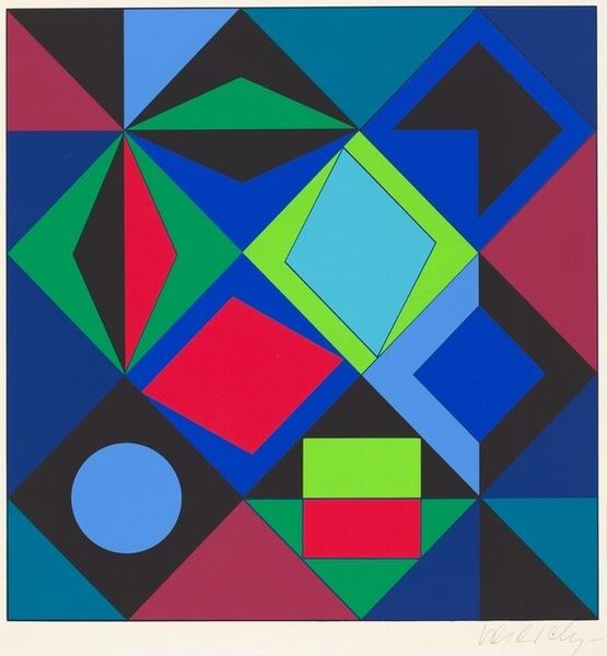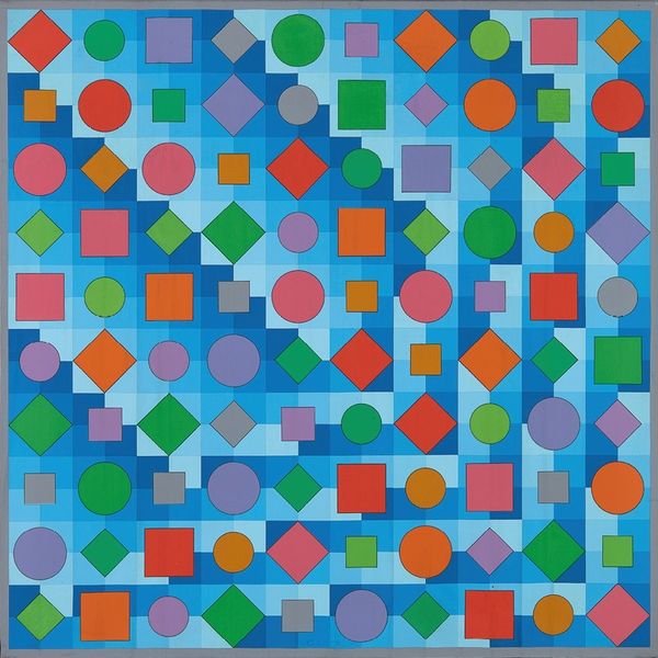 Editor: This is Victor Vasarely’s “St. Céré,” an acrylic on canvas created in 1967. It's a series of vibrant, geometric shapes arranged in neat rows and columns. I’m struck by the playful yet rigid structure. How do you interpret this work in terms of its formal elements? Curator: The strength of "St. Céré" resides in its meticulously calculated arrangement of form and color. Observe how Vasarely uses the square as a foundational module. Do you notice how it’s then divided and subverted with circles and diamond shapes, creating an interplay between stability and dynamism? Editor: Yes, and the repetition is almost hypnotic, but each grouping feels distinct. The color palettes shift slightly in each row too, adding a sense of rhythm. It feels like a system of visual language. Curator: Precisely. Think of semiotics and structuralism – how do the individual shapes function as signs within the larger structure? How does Vasarely construct a visual language where form communicates and generates new meaning? What is the syntax of the painting? Editor: That’s a fascinating way to look at it. I hadn't considered the shapes as parts of a formal, visual syntax. It moves past simple geometry. Curator: Vasarely pushes the eye to oscillate between seeing individual forms and the global composition. How does the painting employ color and composition to produce perceptual tension for the viewer? Editor: I appreciate the perspective on how the visual tension and the shapes, as a type of language, contribute to the work's meaning. Thank you for this deeper insight into the structure. Curator: My pleasure. Reflecting upon its structural language encourages an appreciation of this painting as not only a visually compelling work, but a piece that activates the human eye.