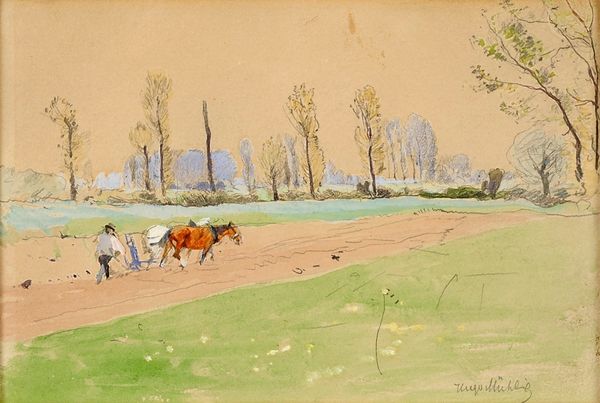 Jules baron Finot captured "Horses in the Meadow" with watercolor on paper. The painting contains a horse lifting its front leg, a seemingly simple scene of rural life, yet it echoes an ancient motif: the rearing horse. This pose, reminiscent of classical equestrian statues, symbolizes power, nobility, and control, dating back to antiquity where it adorned monuments of emperors and gods. Think of the equestrian statue of Marcus Aurelius in Rome, a symbol of imperial might. Here, the context shifts. The horse is not a symbol of power, but of vitality, a life force. The rearing horse transcends its martial connotations. This vitality is also a nod to the cycle of life, death, and rebirth, echoing through time, reappearing on battlefields and meadows. The horse’s gesture engages us on a subconscious level. This motif has been passed down through history, continually transformed by the collective memory and the passage of time, a testament to its enduring symbolic power.