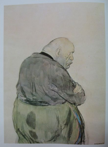 This watercolor portrait of Wilhelm Keitel by Kukryniksy presents a study in caricature, rendered with a striking economy of line and wash. The artist uses a muted palette of browns, grays, and blacks, which evokes a sense of grim austerity. The composition is dominated by the exaggerated features of Keitel's face. Notice how the sharp, angular lines define his brow and nose, creating a sense of severity, while loose washes suggest the bulk of his form. Kukryniksy employs distortion to undermine the authority of the figure. This technique echoes the broader post-structuralist critique of power, questioning the stability of representation and the very notion of fixed identity. Consider how the artist uses the contrast between the controlled lines of the face and the more fluid, gestural marks of the body. This disjunction challenges any unified reading of the subject, leaving us with a figure deconstructed by its own representation. The portrait serves not just as an image but as an interrogation of power and representation.