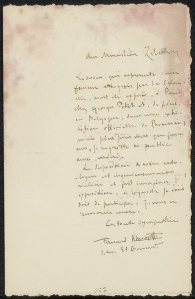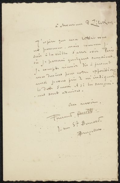Fernand Khnopff, a Belgian symbolist painter, created this letter to Philip Zilcken, a Dutch artist and art critic, in the late 19th or early 20th century using ink on paper. At the time, the art world was governed by institutions such as the Académie des Beaux-Arts, which promoted traditional styles and themes. However, Khnopff and other symbolist artists challenged these norms by exploring subjective, dreamlike, and often unsettling imagery. This letter may be part of the correspondence between artists and critics that shaped the reception of symbolist art. To understand the context of this letter, scholars might consult archives of artistic correspondence, exhibition catalogs, and period publications. These primary sources can shed light on the social networks and intellectual debates that shaped the art of Khnopff's time. Letters such as this offer a look at the social conditions that shape artistic production and reception.