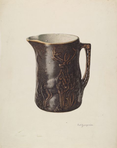 Curator: Welcome. Today, we're looking at Carl Buergerniss's "Pitcher" from 1940, executed in watercolor. Editor: It has a grounded, almost folksy feel, doesn’t it? That muted palette lends it an air of utility rather than ornamentation. Curator: Buergerniss was part of a wave of artists deeply interested in depicting everyday objects. Examining this, the application of watercolor simulates the texture of ceramic quite effectively. He uses layers to mimic depth and weight, emphasizing the craftsmanship involved in pottery making. What social contexts might elevate the mundane to high art during this time? Editor: Perhaps a desire to find beauty in the simplicity of domestic life during a period of upheaval. The 1940s were a time of great social and political change; maybe showcasing a humble pitcher provided a sense of stability. It's interesting how museums contribute to our understanding of 'high' and 'low' art by selectively exhibiting works like this. Curator: Precisely. The rise of industrial production threatened traditional crafts. Representing something like a handmade pitcher, especially rendered with meticulous skill in watercolor, serves to preserve a sense of value tied to pre-industrial techniques. It's a commentary on labor. How do the material choices relate to our contemporary perception? Editor: It does present questions about consumption and worth. The inclusion of grape motifs suggests abundance and celebration, common symbolism even today, especially when serving at dinner parties. The artist might have aimed to promote particular ideologies tied to class and society via art. Curator: That connection to class and social practices, the ways we attach value to specific items based on socio-cultural expectations - those all circle back to the historical narrative within these galleries. Editor: Absolutely. These glimpses into the past encourage reflection and offer profound implications to our current culture. Curator: Well, exploring how something so commonplace opens pathways for deeper discussions, highlighting production and material processes of our shared society, is incredibly enlightening. Editor: Agreed.