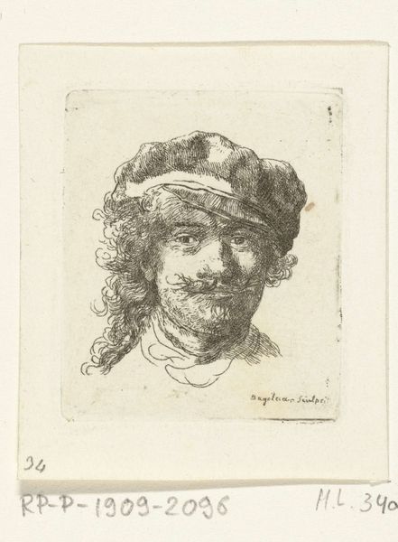 Curator: Looking at this image, one immediately confronts the raw immediacy etched—quite literally—into its surface. This is Rembrandt van Rijn’s “Self-portrait wearing a soft cap: full face, head only,” believed to have been created sometime between 1805 and 1844. Editor: Whoa, something about that gaze…it feels like he's daring me to disagree with him, you know? Very direct. Intense, but with this quiet sadness swirling around his eyes. It's heavy. Curator: Precisely! The etching captures that introspective quality perfectly. The soft cap itself acts as a signifier – a marker of the artist, perhaps of non-conformity. In many self portraits across centuries the artist would show themselves dressed and adorned to suggest social standing, intellectual curiosity and personal confidence, a visual representation of their beliefs. This artist is wearing an informal piece of clothing suggesting they are at work, are comfortable and accessible. Editor: Accessible, maybe, but not an open book, huh? See how he uses shadow, practically engulfing half his face? Almost theatrical, that play between light and dark… Like he’s presenting a partial truth, concealing as much as he reveals. Curator: Consider the era. Rembrandt lived in the Dutch Golden Age, where portraiture was a commodity, reflecting social status. Yet, he turns inward. His focus wasn’t mere likeness, but probing the self. The baroque style lends that characteristic drama, a stark counterpoint to the rising Dutch realism. Editor: Which is funny because the etching, those scribbled lines, that feels super immediate, raw and like, modern? You wouldn't peg it as the Baroque, except maybe for the melodrama happening in his eyes! He gets away with simplifying form because all of his expression, the key essence of his portrait and psychological evaluation is shown so intensely by the artist through the careful observation in capturing and emphasizing expression in the eyes. It gives the etching life. Curator: He often revisited this medium. Etching, with its capacity for intricate detail and tonal variation, became a crucial language for the artist to dissect the self and engage the human condition. He presents himself not as a titan but an everyman, wrestling with interiority, visible in every line, every shadow. Editor: It's stuck with me too. A fascinating reminder that we’re all, artists and viewers alike, perpetually self-examining in search of who we are in life, for the whole of life. A never ending pursuit in the theatre of living!
