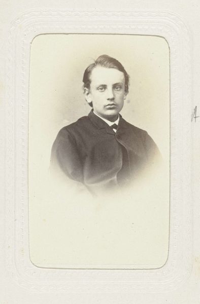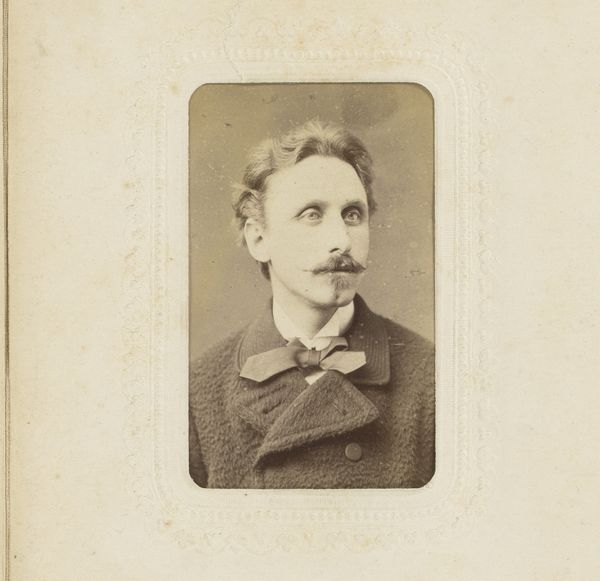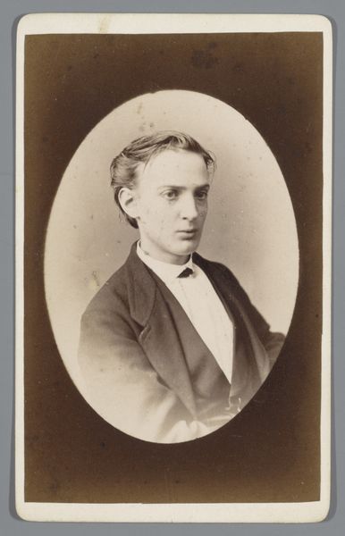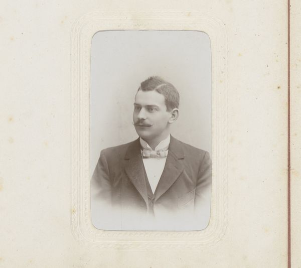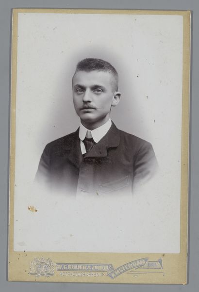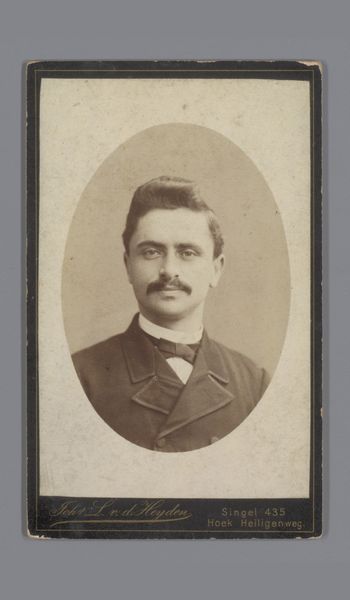Editor: This is a collotype portrait of an unknown man with a mustache, taken sometime between 1885 and 1906 by W.G. Kuijer & Zonen. The oval frame is a bit severe, but the lighting on his face is soft and almost romantic. How would you interpret this portrait, focusing on its visual elements? Curator: Considering the semiotics, let us analyze the form of the portrait. Note the stark contrast created by the oval vignette against the lighter, rectangular card. This juxtaposition immediately directs the viewer’s eye towards the figure’s face, demanding careful scrutiny of its contours and texture. Furthermore, observe how the sharp, dark lines of the man's suit jacket are offset by the softer gradation of tones in his face and hair. Editor: That’s interesting! I hadn't thought about the shapes and how they lead your eye. Curator: Indeed. Even the photographic method itself contributes to the work’s meaning. Collotype printing, with its continuous tones, enables a depth of detail nearly photographic. It suggests a deliberate intent to represent the subject with utmost precision. Observe, moreover, how this emphasis on detail contrasts with the anonymity of the subject. Why make a portrait of this individual in such detail only to then have no idea who they are? Editor: I guess maybe it's a study of a type of person more than about the individual. Do you think the portrait might make us reflect on how we interpret appearances based on their surface-level features? Curator: Precisely. It prompts the observer to scrutinize notions of identity and representation as determined through careful control of dark and light. Ultimately, it urges us to dissect and consider how form and technique operate to shape understanding and assign meaning within a visual construct. Editor: Wow, that's a completely different way of thinking about it. Thanks for pointing that out. Curator: My pleasure, and I hope this formalist approach expands the boundaries of what this photographic portrait signifies for you.