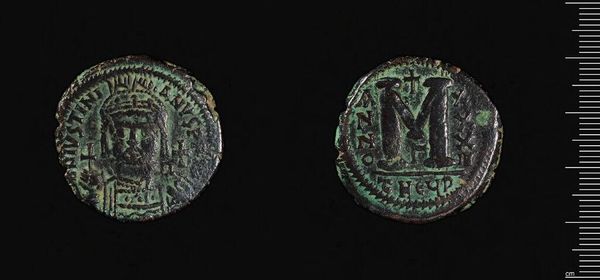 Editor: Here we have a coin of Justin II, a small metal disc etched with figures and symbols. The wear on the surface speaks to its age and circulation. What do you see in this piece? Curator: Well, it's fascinating how a simple coin becomes a vessel for cultural memory. The images – the emperor, religious symbols, and even the lettering – all contribute to a narrative of power, faith, and identity. Notice the figures holding crosses; what do they evoke in you? Editor: I see a declaration of religious authority intertwined with imperial rule. The coin seems to say, "This is who we are." Curator: Precisely. And it's a story told and retold through countless hands over centuries. Consider how such symbols persist and evolve, informing our understanding of ourselves even today. Editor: So, it's not just about currency; it’s about continuous cultural messaging. That's a thought-provoking idea! Curator: Indeed. It is a reminder that even the smallest objects carry the weight of history and meaning.