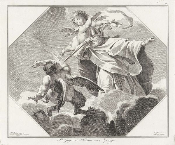 Curator: Oh, this engraving just radiates serene joy! Editor: Indeed. This is Jan Punt's "H. Basilius, patriarch," created in 1754. It's currently held at the Rijksmuseum. Curator: There's such an interesting mix here. That very orderly classical structure trying so hard to contain a kind of swirling, baroque ecstatic vision, isn't there? Editor: The use of line is very pronounced, emphasizing the contrast. Observe the strong outlines defining the figure of Basilius against the ethereal background of clouds and the cherubic figure. The architectural elements are rendered with precision, setting the stage with that sense of grounded realism. Curator: He seems totally open to this cherub who is either giving him the finger or beckoning to him, hovering above a swirling pillow of clouds. I feel such calm seeing Basilius almost floating there. It's a historical painting grounded in the Baroque, almost vibrating with...what do you call it...that drama and emotion, yeah. I wonder what the story is here? Editor: This image blends both figuration and history painting to establish narrative context and imbue its figures with expressive qualities, all rendered in the black-and-white aesthetic that typifies the line engraving tradition. I feel it does create a dynamic composition. Curator: I appreciate the tension. The way it balances the ethereal with a deliberate order. Editor: Ultimately, Punt masterfully uses classical realism, imbuing a conventional format with striking intensity and passion, while simultaneously embracing its own form in terms of the materials used to make this image. It's an interesting mix, and I find that combination is what makes this such an intriguing work to view and reflect upon. Curator: Exactly, a serene, quietly defiant moment, captured with this blend of techniques that shouldn’t quite work together...but oh, they truly do!
