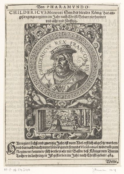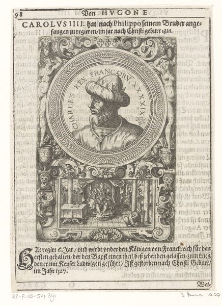 Editor: This is a portrait of Philip V, King of France, crafted in 1598 by Jost Amman. It's a print, an engraving to be exact, currently housed at the Rijksmuseum. The first thing that strikes me is how meticulously detailed it is. It feels both regal and…somehow small. What do you see when you look at it? Curator: "Small" is an interesting take! For me, it evokes the power of symbolism within constraints. Consider that the small scale necessitates an even greater density of information. Jost Amman packs in details of lineage, status, and perhaps a little…shall we say “spin,” considering that accompanying text questioning Phillip’s heir. It seems he reigns through the "Grace of the Salic Law." Do you know anything about that particular "grace"? Editor: Not really, I confess! Curator: It means that a woman could not be queen regnant. It's also intriguing how the Northern Renaissance print aesthetic emphasizes line and detail, versus broad swaths of tone. What feeling do you get from Amman's heavy reliance on the engraving lines, do they seem to contribute any meaning? Editor: I see what you mean about the lines, they make it very... deliberate. It's like every mark had to count. It’s as though those firm lines try to solidify and maybe even 'justify' Philip’s rule. Before this chat, I saw a pretty, old portrait. Now, I'm reading into it! Curator: And isn't that the most thrilling part? How context and close looking transforms mere aesthetics into loaded rhetoric. It makes me wonder what other hidden arguments lay dormant in plain sight around us, hmm?