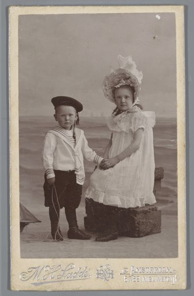 Editor: Here we have a photograph titled, "Portret van een onbekende grootmoeder, moeder en kleinzoon op het strand te Międzyzdroje," taken in 1912 by R. Schulz. It feels incredibly intimate; a real glimpse into the past. How would you approach analyzing it? Curator: The sepia tones lend a visual coherence, simplifying the array of textures: the coarse sand, the woven beach chair, the varied textiles of their garments. Consider how the photographer employs a shallow depth of field. The figures are sharply defined, while the background fades into a soft blur, drawing our eye to the relationship between the sitters. What impact do you think this limited focus has? Editor: It isolates them, almost making them float a little. Is it drawing attention to their relationship? Curator: Precisely. The composition invites contemplation of the vertical elements: the figures themselves, the poles of the beach shelter echoed, drawing the eye upwards. The gaze drifts between them, pulled by contrasts: smooth skin against textured fabric, the youthful boy contrasted by the older women. The formal arrangement, with the subjects rigidly posed and arranged close together in a triangular structure, does also create a feeling of quiet reserve, a subtle but distinct intimacy, yes? Editor: Definitely. I notice the boy is slightly off-center, with that beach chair balancing the composition. That little cart looks like the modern bucket-and-spade set, that kids use to play on the beach even today. Curator: Indeed. Through careful arrangement, Schulz delivers an evocative representation of family at the shore. I am most struck by the tonal range and how the sepia coloring reinforces a visual harmony. A subtle piece; what are your lasting impressions? Editor: For me, it's the contrast of the sharp focus on the people against the blurry beach scene, they're close, but somewhat distanced from their environment. Curator: I find the photograph provides the feeling of enduring strength of family.