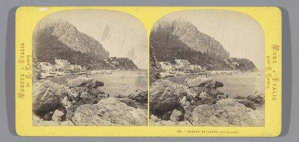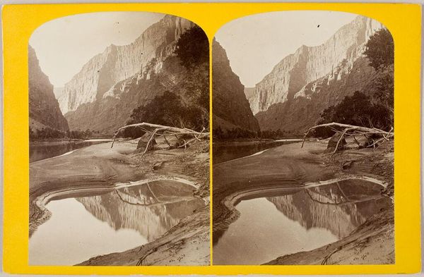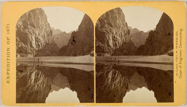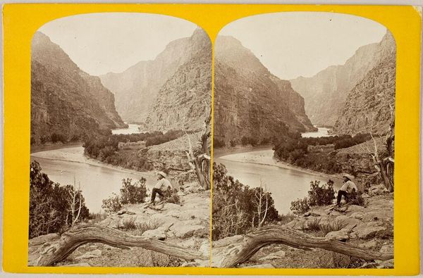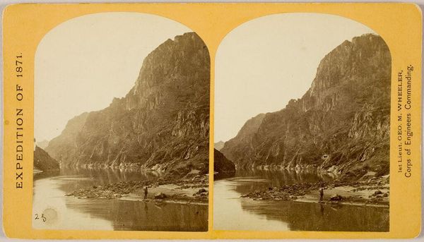 Editor: This is "First halt within the Black Cañon," a stereograph by Timothy O'Sullivan. The landscape feels so imposing and vast. What symbols do you see in this image? Curator: The canyon itself! It's a potent symbol of the unknown, the challenges of westward expansion, and the sheer scale of the American landscape. The expedition party becomes a symbol of human ambition, dwarfed by nature's grandeur. It speaks of the cultural memory and continuity of exploring, even dominating, the land. Editor: So, the small scale of the figures is not just a factual representation? Curator: No, it's a conscious choice. How does that contrast play against the promise of exploration? Editor: It really emphasizes our relationship to the natural world. I never thought about the symbolism within landscape photography like that before.
