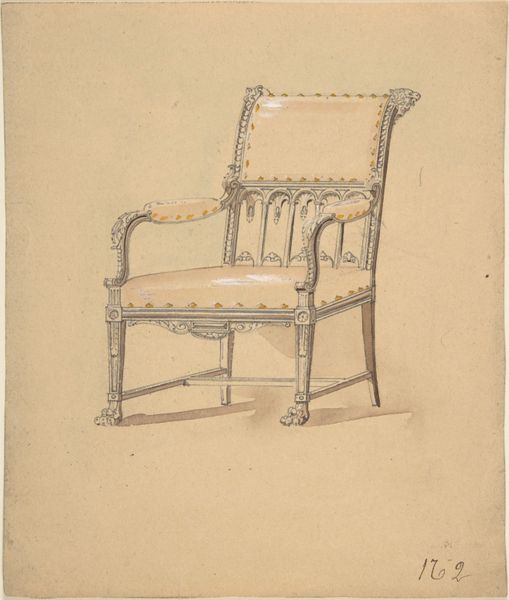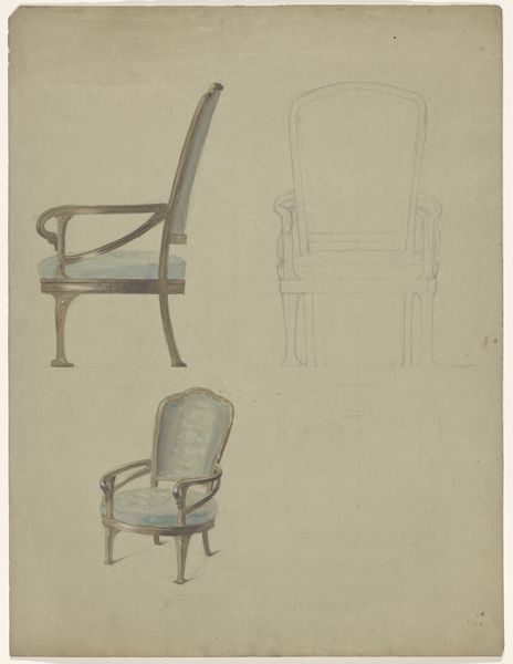 Editor: This is "Vier armstoelen met beklede zittingen, van links gezien," a pencil drawing from 1823 by Carl Wilhelm Marckwort. It feels very architectural, like a study of form and line. What do you see in this piece? Curator: The emphasis is clearly on form. Note how Marckwort utilizes the stark contrast of line to define the distinct character of each chair. Consider the geometry; the rectangle of the seat contrasts with the curves of the arms and legs. It exemplifies Neoclassical principles, particularly its adherence to symmetry, balance, and order. It is reminiscent of a geometric proof. Editor: It’s interesting you call it geometric. The slight variations in the chairs give them each such unique personalities! Curator: Indeed, but even these “personalities,” as you call them, are governed by line and shape. The hatching and cross-hatching, the density and sparsity of the pencil strokes—all contribute to a perception of volume and texture within a primarily linear framework. Consider it a structured study of volume and void. The variations underscore Marckwort's deliberate compositional choice; four iterations of the same idea, viewed from the same vantage point. Editor: So the personality comes from the arrangement of line, shape, and texture, all working within very structured forms. I guess I was looking for the forest and missing the trees. Curator: Precisely. We can analyze how a structural approach dictates even the perceived “personality”. And understanding this allows a far richer aesthetic experience with this work. Editor: This was an insightful study in structure. I see this drawing, and indeed art, differently now.