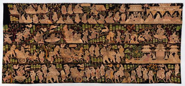 This impressive embroidered carpet was made in 1835 by Zeruah H. Guernsey Caswell. Composed of individual squares joined together, it's a great example of needlework. Each square features meticulously stitched motifs, mainly floral designs, along with animals and even human figures, all rendered in wool on a dark ground. The technique involves layering threads to build up texture and depth, a process demanding time and precision. Looking closely, you can see the direction of the stitches creating subtle patterns within each form. The carpet is infused with cultural significance. Needlework like this was a common pursuit for women in the 19th century, and the amount of work involved speaks to the social expectations placed on women, and the use of their time. But it also became a powerful means of expression. Considering the materials, the making, and the social context allows us to appreciate the meaning of the artwork, challenging any assumed distinctions between fine art and craft.