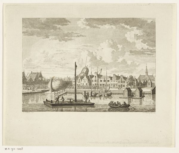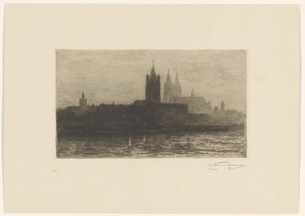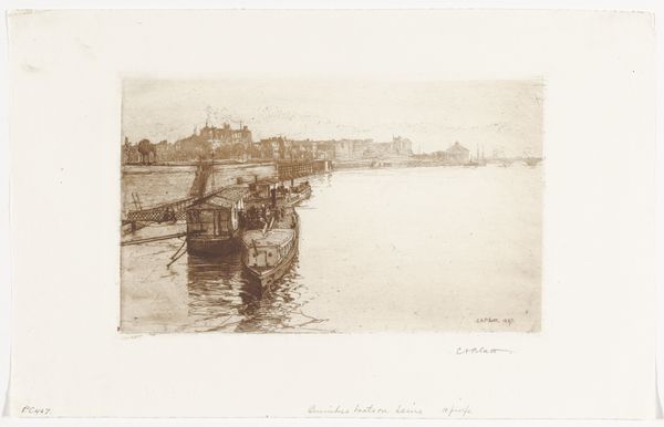 Editor: This is Eugène Bejot’s 1930 etching, "Haven voor Dieppe," or "Port of Dieppe." It feels almost photographic, yet dreamlike in its soft, muted tones. What do you see in this piece, especially considering the visual symbols at play? Curator: Well, the church towers immediately dominate the skyline, acting as anchors – both visually and spiritually. Can you feel how they convey stability, permanence? In contrast, look at the water; what emotions does it invoke for you? Editor: I see what you mean about the church. And the water makes me feel that sense of movement, change. Like life, it’s constantly flowing and reflecting everything around it. The boats add to that, too. Curator: Exactly! And notice how the artist positions the church in the very center, suggesting an axis mundi, the symbolic center of the world, around which this community revolves. But what kind of feeling do the reflections on the water generate in your perception? Editor: An overwhelming sensation. The doubling creates depth, and almost suggests hidden or unconscious parts of the city. It feels as though you're also looking into a different, veiled dimension of Dieppe. It gives the harbor so much more feeling, more impact! Curator: Precisely. Those visual echoes ripple outward from the heart of the town, implying memory and time layered upon the present moment. And look how art nouveau has also been employed to suggest movement with every tiny line! Editor: So, beyond just being a cityscape, it uses those visual symbols to suggest something about Dieppe's history and identity? I hadn't really considered the reflections that way before. Curator: Indeed. Art often speaks in a visual language beyond the immediately visible. Today, our image of cultural continuity can gain from appreciating the weight of even such quiet visual metaphors.