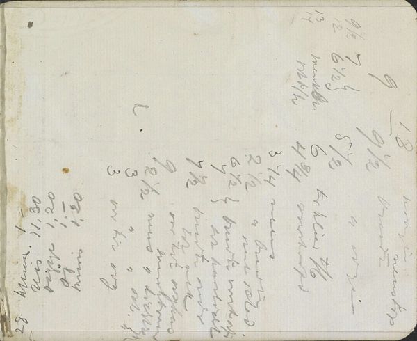 These Annotations were made by George Hendrik Breitner, in the Netherlands, but the specific date is unknown. This page from one of Breitner's sketchbooks takes us behind the scenes of the artistic process, showing the artist's immediate thoughts. Breitner was known for his unflinching depictions of working-class life in Amsterdam. His art challenged the dominant, idealized representations of Dutch society in the late 19th and early 20th centuries. During this period, the Netherlands was undergoing rapid industrialization and urbanization, leading to significant social changes. Breitner's sketchbooks, like this one, offer valuable insights into his creative process. They act as primary source documents that allow historians to understand better the social conditions that shaped artistic production. By studying such materials, we can explore the artist's personal reflections and gain a deeper understanding of the artwork in its social and institutional context.