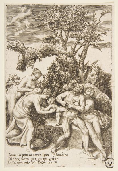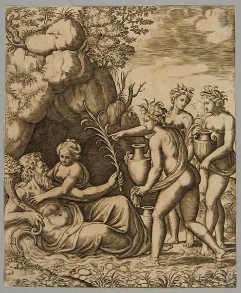 Curator: This is Carlo Cesio's "Diana Embracing the Sleeping Endymion." Editor: My first thought is intimacy. It feels very tender, yet also carries an undercurrent of power imbalance. Curator: The piece depicts the myth of Diana, the moon goddess, gazing upon the shepherd Endymion. The story has been interpreted as divine love or even a commentary on class and gender roles. Editor: Absolutely. The dog at Endymion's feet, the cherubic figures... they all point to established visual tropes of fidelity and innocence, but her gaze unsettles that reading. What does it mean for a goddess to desire a mortal this way? Curator: The visual language of divinity is upended here, with Endymion vulnerable in his sleep. It’s a visual representation of the complexities of desire and unequal power dynamics. Editor: A fascinating subversion of the expected narrative, indeed. It provides a fresh perspective on a familiar tale.