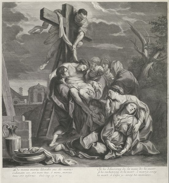 Louis Surugue created this print, "Samuel Prays to God for Rain," sometime between the late 17th and early 18th centuries. In this scene, the prophet Samuel is depicted kneeling, arms raised in supplication, amidst a crowd of figures reacting with fear and awe to the divine display of power. Let's consider the historical context. Surugue was working in an era marked by significant religious and political upheaval. Religious narratives were often used to convey moral lessons and reinforce societal norms. What is so interesting about this, is how it depicts the relationship between humanity and divinity. The emotional intensity captured in the figures' faces, from terror to reverence, invites us to contemplate the power dynamics at play. The lightning and dark sky can almost make us feel the fear experienced by the community. How does Surugue's depiction challenge or reinforce existing power structures?