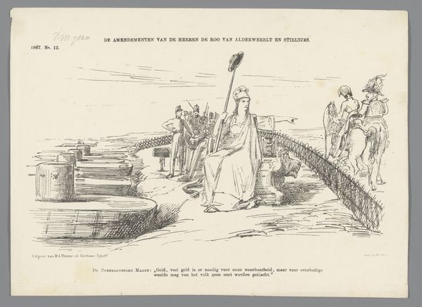 Curator: This etching, created in 1875 by Johan Michaël Schmidt Crans, is titled "Spotprent op de plannen tot aflossing van de nationale schuld," which translates to "Cartoon on the plans for the repayment of the national debt." Editor: The overall feel is stark, yet filled with subtle commentary. The contrast between the standing figure and the wading one immediately evokes tension. What do you make of that heavy symbolism? Curator: Given the title, it’s clear this image engages with the political discourse of the time, likely critiquing the burden placed on the colonies to alleviate the national debt of the Netherlands. Look at the man, presumed to be a Dutch colonial official guarding the treasure chest of "53 Million", juxtaposed against the Indonesian mother wading through water, seemingly pleading for help. Editor: That posture, with her hand raised towards the sky, and cradling the child suggests both desperation and hope. Her struggle immediately made me think of classical depictions of suffering, the Madonna perhaps. What do the riches in the chest symbolise? Curator: The treasure chest labeled "Schat," meaning "treasure," and displaying a hefty sum of 53 million, represents the wealth extracted from the colonies. The amortization scroll asking for 10 million emphasizes the demand on colonial resources to service the national debt, at the expense of those depicted drowning. Editor: The artist powerfully juxtaposes Western opulence and colonial deprivation through his depiction of figures, both as social types and as visual icons of injustice. His composition employs traditional symbols to evoke collective empathy. Curator: Precisely. The imagery plays on contemporary anxieties surrounding the national debt while commenting directly on colonial policy and its effect. This etching’s satirical edge sheds light on economic exploitation through caricature. Editor: Indeed. Even through the rather rudimentary lines of the print, the scene reveals the complex power dynamics that have shaped perceptions and lived realities. Curator: It's a potent visual argument for its time, and still provokes reflection today on the legacies of colonialism and economic disparity. Editor: It does make you question the values driving these historical power dynamics, even when the treasures might seem to be overflowing.