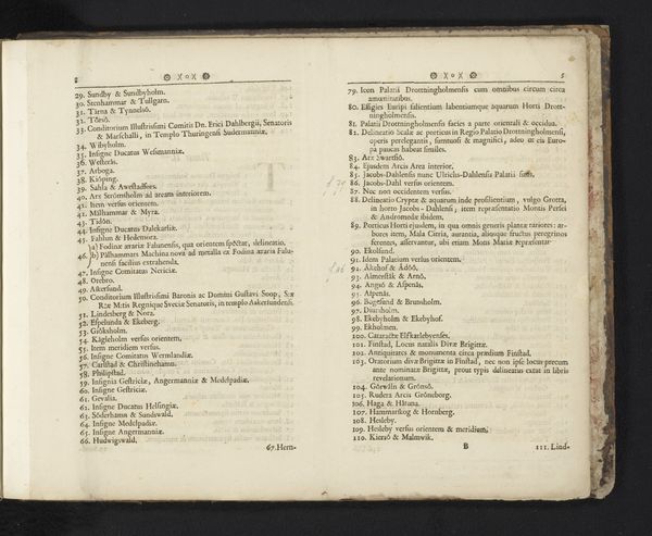 Curator: Here we have “Inhoudsopgave voor Roma Pertubata, 1706” a print on paper by Carel Allard, dating back to around 1706 or 1707. It resides in the collection of the Rijksmuseum. Editor: Yes, it feels really dense and almost claustrophobic with all that tightly packed text. What’s your eye drawn to first when you look at this work? Curator: Immediately, the bilateral symmetry asserts itself—the composition, bisected, demands a comparative reading. Note how Allard uses the book's gutter as a visual spine. Can you discern the implied relationship between these two fields of text? Editor: It's like each page is mirroring the other, yet they both contain distinct information… Almost like comparing contrasting points. Curator: Precisely. This is where form mirrors content. Look closely—can you detect any repeated visual motifs or structural elements? What effect do they produce? Editor: Well, each numbered section begins with that bold capitalized descriptor... "ZINNEBEELD". They guide your eye. Are they some kind of key to decode this print? Curator: A perceptive observation. Indeed, "Zinnebeeld" translates roughly to "emblem" or "allegory." Thus, we aren’t merely seeing text, but a structured system of symbolic representation, guiding the viewer toward deeper meaning embedded within each numbered declaration. Each declaration, and by extension, the whole work. What is gained or lost through its composition, though? Editor: Seeing the structural elements helps contextualize what otherwise feels overwhelming and unstructured. I think I’m starting to get the allegory that binds everything! Curator: Indeed. An allegorical catalogue designed to be dissected through textual and structural analyses!