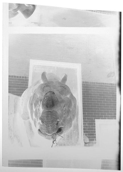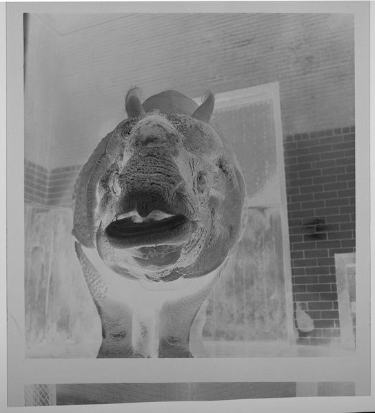 Editor: Here we have an untitled photograph by Jack Gould of a rhinoceros. It’s a small, close-up view. The inverted tones give it a ghostly, almost ethereal feel. What strikes you about this image? Curator: The photograph's inversion highlights power dynamics. The rhino, often presented as a symbol of wildness, is captured within a zoo. What does it mean to see this creature, usually exoticized, mediated through both photography and captivity? How does this image, likely taken during a period of increasing environmental awareness, speak to our relationship with the natural world? Editor: That’s a powerful way to look at it. It's not just a picture of an animal, but a statement on control and conservation. Curator: Exactly. And perhaps a reflection on the gaze itself. Who is looking at whom, and what narratives are being constructed?