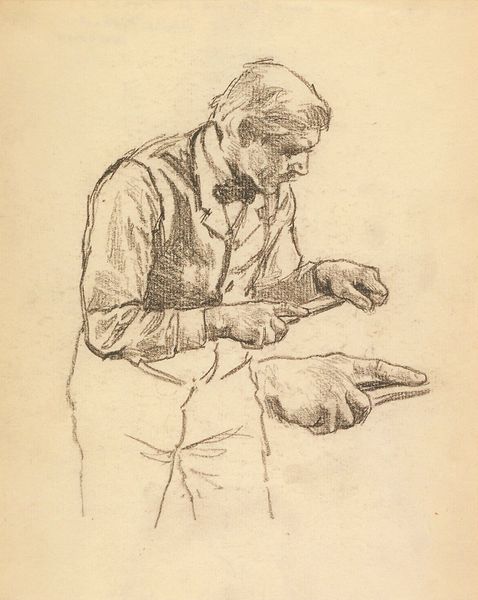 This sketch of Mr. James Derby playing the violin was made by James Ward using graphite on paper. Ward’s technique here is quite traditional, yet it's how he uses this medium that is most striking. Notice the almost frantic, searching quality of the lines, especially around the hands and face. Ward coaxes out his likeness through a web of strokes, piling up the darkness to create the figure, which is very immediate and intimate. The marks feel unmediated, as though the artist is thinking aloud through his pencil. In the absence of other information, we can appreciate the skill of a professional artist, deeply embedded in a specific culture and time. It is through these elements that the work gains its significance, blurring the lines between fine art and the craft of drawing.