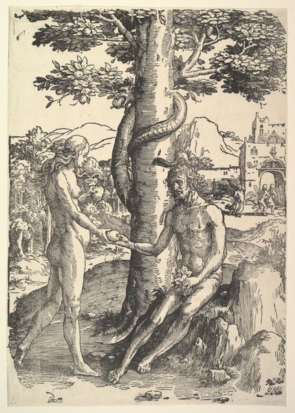 Lucas van Leyden made this print, 'The Fall of Man', using an engraving technique sometime in the early 16th century. Engraving is an intaglio process; the artist uses a tool called a burin to manually incise lines into a metal plate, which holds ink and transfers the image to paper. The controlled, deliberate nature of engraving allowed Lucas van Leyden to achieve fine detail and tonal variation in the image, evident in the figures' musculature, the textures of the tree bark, and the subtle gradations of light and shadow. This printmaking technique demanded a high degree of skill and control, differentiating it from the more direct, gestural qualities of drawing or painting. In its time, this print would have been relatively easy to reproduce and circulate, making art more accessible to a wider audience. The work's social impact lies in this dissemination of images and ideas, achieved through skilled labor and the mechanics of reproduction. So, in a way, even this image of original sin is tied up with human ingenuity.