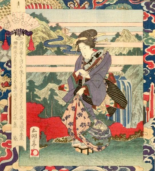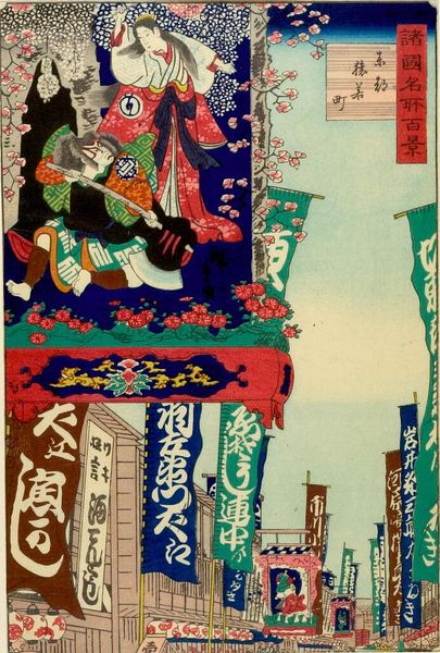 Tsukioka Yoshitoshi created this woodblock print depicting an Imayō dance, a popular song and dance form, performed at the Kimpeirō house in the Yoshiwara district. Note the prominent display of the dancers' elaborate headwear, each adorned with stylized ornaments. These ornaments, reminiscent of ancient headdresses, echo motifs found in earlier Shinto rituals, where ceremonial attire symbolized a connection to the divine. Similar headdresses can be found across cultures, from ancient Egyptian royalty to Grecian gods, where they mark status and authority. The fan, held delicately in the dancer's hand, is not merely an accessory, but a symbol of power and control. It reappears in many paintings across time, from ancient Crete to Imperial China. Such gestures and symbols tap into a reservoir of collective memory, resonating with viewers on a subconscious level. They represent a non-linear, cyclical progression, resurfacing, evolving, and taking on new meanings in different historical contexts.