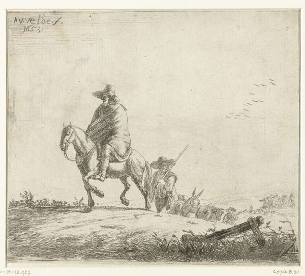 Editor: So, here we have "A Rider and Herdsmen with Cattle on a Sandy Road," an etching by Adam von Bartsch from 1803, currently held at the Rijksmuseum. The mood feels very tranquil, almost melancholic, and I'm struck by the vast, open sky. What do you see in this piece? Curator: You know, when I look at this, I imagine the sound of hooves muffled by sand. There's a tangible stillness, isn't there? Bartsch captures a genre scene— everyday life elevated. The riders, the cattle, even that dilapidated fence – they whisper stories of pastoral existence, perhaps idealized, yet so beautifully rendered. It is a dance of light and shadow, a moment suspended. Do you find yourself drawn to the detail, or the overall composition? Editor: I think it’s the contrast between the detailed foreground and the hazy background that pulls me in. It's like focusing on a memory that's both sharp and faded. Curator: Precisely! Romanticism often plays with that tension. It makes you consider what's truly present versus what lingers in the realm of the remembered. Notice how Bartsch uses etching to achieve these subtle tonal variations? It’s almost like he’s painting with light. What feelings does the vastness of the landscape evoke for you? Editor: A sense of freedom, maybe? And also a touch of loneliness... Curator: A lovely duality! Art, at its best, holds these seeming contradictions in balance, allowing us to experience the richness of the human condition. I used to think Romanticism was so soppy, but it makes you wonder if artists from that time knew something about beauty. What a poignant slice of life! Editor: Definitely. I’ll never look at an open landscape the same way again. It's like learning a new language, isn’t it? Curator: Exactly, now, how do we say ‘open landscape’ in the language of art?