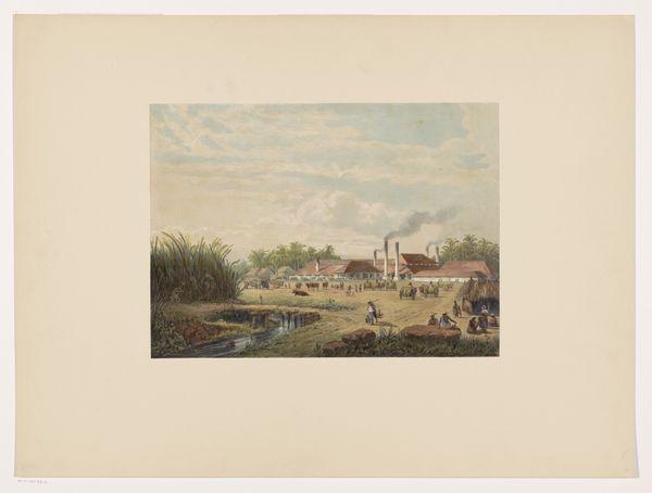 Editor: Here we have J.E. Ljung's watercolor, "Gezigt op Mariana's oord, genomen uit het Koepelhuis van den Assistent Resident te Pontianak," created sometime between 1800 and 1900. It depicts a view of what looks like a colonial settlement. The painting seems very serene, almost idyllic, despite its somewhat clinical precision. How do you interpret this work? Curator: The visual precision you noted is key. It's a meticulously rendered landscape, almost like a cartographic survey, which speaks volumes about the period. The scene, while seemingly peaceful, must be understood in the context of Dutch colonialism in Southeast Asia. Editor: So, the tranquility might be deceptive? Curator: Precisely. This isn’t just a landscape; it's a depiction of power and control. Consider the vantage point - "from the Koepelhuis of the Assistant Resident." This positions the viewer, implicitly, as part of the colonial administration, looking down upon and surveying their domain. The seemingly simple act of observation becomes an act of dominance. What does the orderly arrangement of buildings and the prominently displayed flags suggest to you? Editor: I guess the flags are declarations of ownership and control. It’s not just a settlement; it's a projection of Dutch authority. It feels…calculated. The artist’s careful presentation almost seems to be whitewashing a more complex and likely exploitative situation. Curator: Exactly! The artwork becomes a tool of colonial ideology. It presents a curated, controlled image of colonial life, downplaying the inherent violence and inequalities of the system. It reinforces the colonial narrative of order and progress. Editor: So, reading between the lines, or perhaps, interpreting the subtext of the image, reveals a critical commentary on colonial power? It’s like the artwork inadvertently exposes the mechanisms of colonial control. Curator: Absolutely! And by understanding the historical and social context, we move beyond a superficial appreciation of the aesthetic and engage with the artwork's deeper, more politically charged meaning. Editor: That's fascinating. I'll never look at a landscape painting the same way again. I now understand that art is deeply intertwined with socio-political narratives, which allows for varied readings.