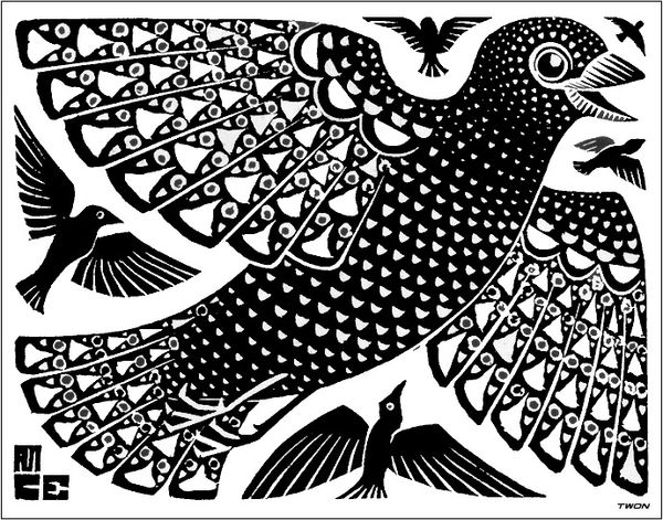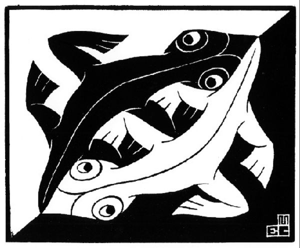 M.C. Escher created this woodcut titled "Plane-filling Motif with Fish and Bird" which embodies his exploration of mathematical concepts like tessellations, which fit together without gaps or overlaps. Escher's fascination with tessellations reflects a broader interest in the structure of the universe, shared by many artists in the early to mid-20th century as they grappled with social and political uncertainty. Escher was known to say, “The things I want to express are so beautiful and pure." His work offers an escape into a world of symmetry and order. The black and white contrast creates a visually striking image, with each fish meticulously detailed. The repetitive nature of the pattern invites contemplation on themes of infinity, unity and the relationship between individual elements and the whole. Escher's image becomes a metaphor for the interconnectedness of life. It asks us to consider how we fit into the world, and how we are all part of a larger pattern.
