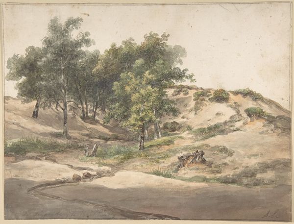 Curator: Oh, look at this! It's Francis Towne's watercolor, "An Ivy Covered Ruin," painted between 1785 and 1795. Editor: Aww, that's so melancholic! I immediately imagine someone aimlessly wandering amidst ruins, reminiscing about forgotten times. What do you make of it? Curator: Ruins in art are heavy with symbolism, especially during the Romantic era. They often represent the transience of human achievement, the power of nature to reclaim what was built, and even a nostalgic longing for a lost past. Thinkers pondered civilization’s cyclical rise and fall. Editor: I see that, for sure! It almost feels like nature's got beef with architecture. Like, "You built it? I'll grow over it!". I wonder, does the ruin look particularly English to you? Is there anything archetypal that tells you more? Curator: Well, Francis Towne spent a good amount of time in Italy studying ruins and applying his precise plein-air approach. It’s more generally Neoclassical in the crisp forms but very English because of its pastoral calm. You get a very particular sensation, which fits into the late 1700s, but which in time keeps recurring. Editor: Neoclassical calm—I like that! It's like, even in the face of decay, there's a sort of serene acceptance, you know? And speaking of those ivy covered walls, what sort of feeling did the artists want us to get from his drawings? Did Towne use a specific perspective trick here to amplify the romantic aspect? Curator: There is a play of light, sure. But I’d say it’s mainly the stark contrast between geometric man-made structures and wild organic growth which tells a story. That little dark entrance adds a dash of mystery, no? What does that gap conceal, in terms of the historical meaning of this cultural item? Editor: Definitely, maybe a portal through time itself? This reminds me that beauty is there, waiting to be noticed everywhere even within decay and historical absence. Curator: Quite beautifully said! It’s paintings like these that bring to mind what we preserve and what we leave to weather the test of time. Editor: And which parts we choose to remember or leave in obscurity to give rise to future ruins that await rediscovery. What a fantastic point. Thank you.