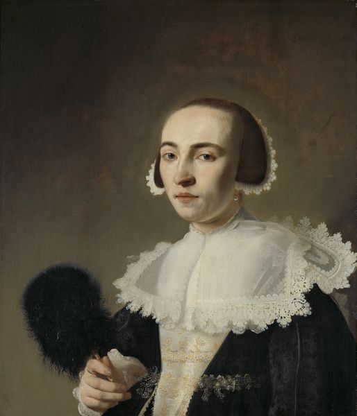 Curator: Let’s discuss "Portrait of a Seated Woman Holding a Fan" by Frans Hals, created circa 1650, a captivating work executed in oil paint. Editor: Instantly, the contrast gets me—the woman practically emerges from that almost aggressively brown background. There's an odd sense of quiet drama. Curator: Precisely, the baroque portrait, classified as a genre painting, leverages contrast meticulously. Observe the subject’s dress, constructed through layers of thick paint applied with swift, almost impulsive brushstrokes, a signature element of Hals' style. Editor: Her gaze, too—it's quite direct. She's holding that fan, but it's almost like she's challenging you. I imagine she's incredibly intelligent, even perhaps, a bit formidable. I'm captivated by the lace detailing of the collar; a real masterpiece. Curator: Yes, notice how Hals brilliantly manipulates light and shadow across the white fabric, a play of tonality against the relative matte black. Consider also how that light is diffused to subtly define the contours of her face. It’s masterful economy of technique; pure optical rendering. Editor: And the subtle colour play! It isn’t monotone. The browns dance from sepia to umber to sienna, lending real vibrancy. The slight flush on her cheek – is it her youth, her status? I think of writers like Austen crafting characters, and suddenly, here's one from just a few brushstrokes, daring me to fill in the gaps of her world! Curator: The structural semiotics cannot be ignored; the brooch, for example, communicates certain socioeconomic signals as do the materiality of dress and fabric, indicative of specific placement within 17th century Dutch society. Hals has codified these carefully, making the sitter knowable within that context. Editor: In other words, it's far more than just pretty lady with fan. She tells us a story! Looking at her rings too makes you think: what is the story of this woman's world and where can one become just as involved? Curator: Quite so; each detail works toward reinforcing social narratives but the sheer verve of his technique rescues it from formality. Editor: Ultimately, what stays is the sense of lively immediacy, that direct, unwavering look from those eyes. I'd spend hours dreaming up stories for her life, based on this singular glance alone!