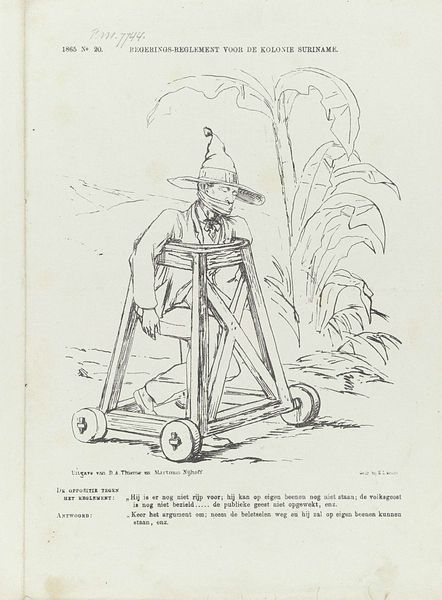 Curator: This drawing, “Spotprent op de suikerindustrie, 1865” by Johan Michaël Schmidt Crans, crafted with ink, immediately strikes me with its directness. What’s your first impression? Editor: It's intriguing! The figures are these pointy, almost gnome-like characters next to a much taller, somber figure with what looks like a sugarcane stalk. It’s clearly a caricature, but what’s the underlying message? Curator: I read this as a potent commentary on the economics of sugar production at the time. Notice how the figures, labeled "beetroot sugar", seem almost collaborative, whereas the figure holding the sugar cane appears solitary, and quite burdened. Editor: So, is this about the shift in the sugar industry from cane sugar to beet sugar, and its effect on labor practices and markets? Curator: Exactly! The medium, ink, lends itself to the mass production and dissemination of such critiques. These satirical drawings were printed to influence public opinion on the exploitative nature of sugar production during this period. We can also examine the materiality of paper and ink, considering the social contexts of its creation and consumption to draw further insight from this piece. What statement is the artist trying to convey about labor and consumption? Editor: I guess, beyond just depicting a change in the sugar source, it speaks to the human cost and exploitation embedded in those materials. Thanks, it gives the work much more significance! Curator: It’s a prime example of how the simplest materials can embody complex social critiques. Now, go forth and do the work, remembering these material foundations in everything you see!