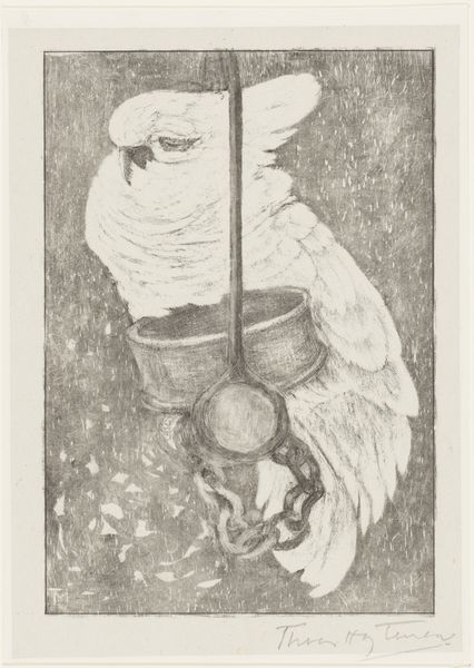 Editor: We’re looking at "Pappie (Schreeuwende kaketoe)"—"Daddy (Screaming Cockatoo)"—a woodcut by Samuel Jessurun de Mesquita, circa 1900-1918. It’s quite striking, the stark contrast and how the bird seems trapped within that heavy frame. What do you see in this piece, focusing on its visual construction? Curator: The work's strength resides in its formal elements. The stark black and white contrast, typical of woodcut, creates immediate visual tension. Observe the dynamism implied by the diagonal of the branch bisecting the rectangular frame; this formal rupture unsettles the composition and injects instability. How do you interpret the bird’s placement within this frame? Editor: I see that now; it feels unbalanced. It’s like the frame is a cage, but also constricting the view. Do you think that asymmetry contributes to the feeling that the cockatoo is screaming? Curator: Precisely. The aggressive diagonal combined with the implied sound—indicated by the title and the open beak—culminates in a sensation of contained, yet unbridled expression. The visual weight is cleverly distributed; the density of black in the upper right wing counterbalances the bird's body, which in turn prevents the image from tilting, literally or figuratively. Editor: That’s fascinating. I was so focused on the subject that I missed how the artist carefully balanced the visual weight. Curator: It is in this interplay of line, form, and implied action, rendered with a symbolic approach characteristic of the period, that the piece derives its evocative power. Mesquita coaxes meaning from the most economical of means. What new appreciation do you have for it now? Editor: I now notice how carefully constructed and purposeful it all is, which enriches how I now perceive the cockatoo. Thanks. Curator: It's rewarding when analyzing structural choices helps you realize and feel more.