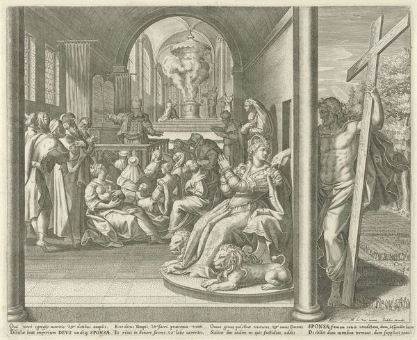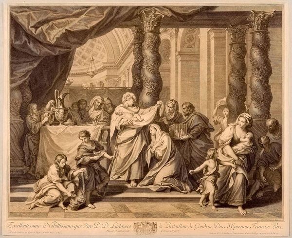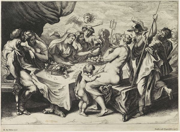 Curator: Simon François Ravenet the Elder presents “The Death of Seneca,” an engraving depicting the philosopher’s suicide. The scene is quite affecting at first glance, wouldn't you agree? Editor: Yes, dramatically so. You immediately notice the starkness of the composition, the way the figures are grouped so tightly around Seneca, emphasizing his vulnerability. What kind of paper and ink was used to render these fine lines? Curator: The engraving process allows for incredibly precise details. Consider Seneca's extended hand, offering a poignant symbolic gesture. Is he reaching out for knowledge, for solace, or perhaps even for death itself? The act of suicide, in Seneca's time, had complex philosophical implications. Editor: And note the economic implications of such a print! Ravenet likely worked within a larger workshop system, where labor was divided. This image would have been reproduced and distributed widely, making philosophy accessible to a broader audience, a commodity, if you will. Curator: Indeed. The cultural memory of Seneca, a symbol of stoicism, becomes a shared experience through this accessible medium. It's a fascinating intersection of personal tragedy and public consumption. Editor: Ultimately, it makes me consider the tension between the unique artistic labor of the engraver and the mass production of images that this method enabled. Curator: A potent reminder that even in depictions of death, life, in the form of production and circulation, continues.