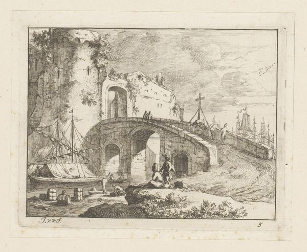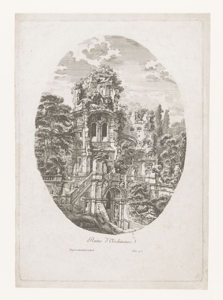 This print, "View of a Part of the Palace of the Caesars" by Jean Barbault, presents us with a study in contrasts rendered through etching. The architecture is set against the Roman landscape, which invites us to consider the dialogue between nature and classical antiquity. Notice the use of line; Barbault employs hatching and cross-hatching to model form, creating depth and shadow that accentuates the ruin's texture and mass. The composition divides our attention between the overgrown ruins on the left and the more defined architectural structure on the right, all under a sky filled with active cloud formations. The artist uses these elements to examine themes of decay, memory, and the sublime. Consider how Barbault uses a semiotic system. The ruins stand as a signifier of lost power and the transience of human achievement, while the natural world reclaims these grand structures. This image invites ongoing interpretation, questioning fixed notions of historical grandeur.