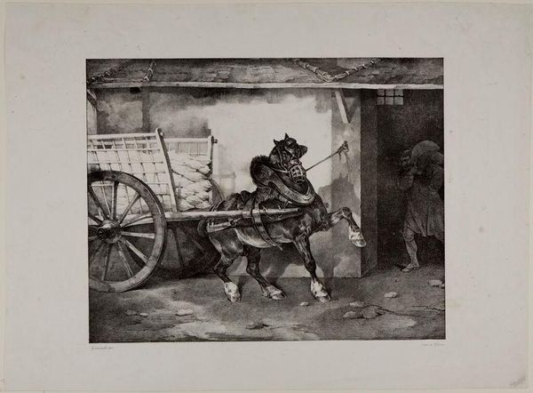 Théodore Géricault made this lithograph, "Het paard van de stukadoor", which translates as "The Plasterer's Horse", in France, around 1821. It depicts a working horse hitched to a cart, suggesting the urban environment of Paris, where the plasterer plied his trade, and new buildings were constantly under construction. Géricault's print offers a fascinating window into the social realities of early 19th-century France. The horse, a vital part of the city's infrastructure, is rendered with remarkable realism, its muscular form and weary stance speaking to the physical demands of labor. We might consider how the artist’s emphasis on the dignity of labor challenged the prevailing class structures of the time. Did it critique the institutions of art that often ignored the lives of working-class citizens? To truly understand this artwork, one might delve into the social and economic history of France during the Restoration period, when artists explored new roles for themselves in a rapidly changing society.