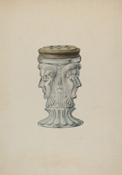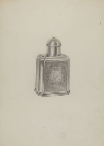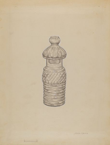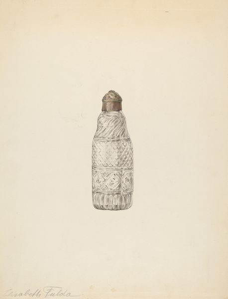 Editor: We're looking at Elisabeth Fulda's "Mustard Pot," a pencil drawing from around 1939. There's a quietness to it, a simplicity... almost like a memory rendered in soft graphite. What catches your eye when you look at this? Curator: It whispers of bygone eras, doesn’t it? I am drawn to the play of light on glass, or the illusion of glass created by the pencil. It's a still life, yet full of implied movement, you can almost hear the clink of a spoon against the jar. Do you see how the artist isolates the object against the blank page, placing it center stage? It becomes a singular meditation. Editor: I hadn't thought about it that way. It seems like the mundaneness of something like a mustard pot is elevated. Is it supposed to be a beautiful object in its own right? Curator: Precisely! The artist invites us to consider the beauty in everyday objects. Look closely – the repetition of those little circles around the glass, like tiny jewels. Does the artist subtly celebrate the design? Or is the artist maybe feeling something more complicated— nostalgia, perhaps, or even the fragility of these ordinary pleasures. What do you think? Editor: That idea of fragility really resonates, especially thinking about it being created on the cusp of the Second World War. There's a stillness, yes, but maybe also a kind of anxious holding onto simpler things. Curator: An astute observation. I am struck by the potential for even a mundane thing such as a mustard pot to act as an emotional time capsule, wouldn't you agree? It is incredible to realize all this feeling coming out of the pencil’s graphite on a simple piece of paper. Editor: Absolutely. I’ll definitely look at still life art differently now. Thanks!