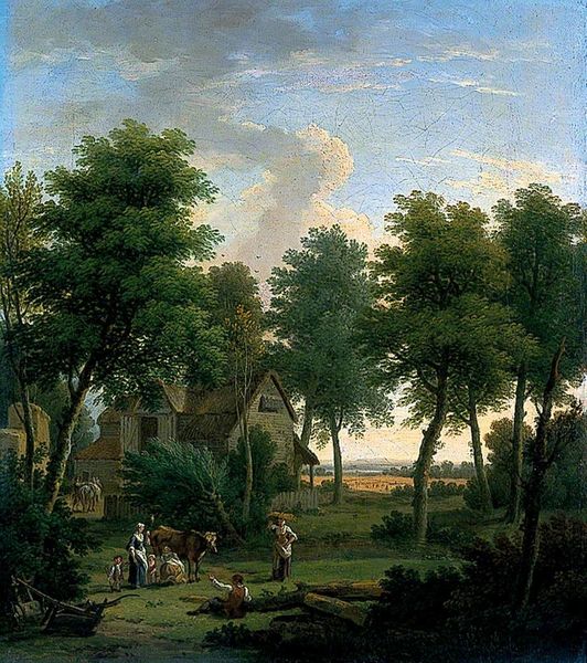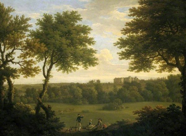 Curator: Before us hangs “An Extensive Landscape.” Attributed to Paul Bril, this oil painting offers a sweeping vista characteristic of Italian Renaissance sensibilities. Editor: Oh, my! It feels like peeking into a dream. That hazy light… it’s almost too perfect, too idealized. Curator: Indeed. Observe how the composition employs a deliberate recession into space. The foreground, bathed in shadow, yields to a brighter middle ground and finally a distant, almost ethereal horizon. Consider the interplay of light and shadow; Bril uses it to sculpt form and delineate spatial relationships. Editor: You know, it makes me think of stage design! Everything’s carefully placed, from the figures to the hills. It's beautifully constructed, of course, but lacks… spontaneity, maybe? I’d love to loosen it up, smudge those perfect lines a little. Curator: Perhaps, but one could argue that the painting’s adherence to compositional principles serves to elevate the landscape beyond mere topography. It speaks to an ordered, harmonious vision of nature reflecting divine ideals. The details like the staffage, tiny figures within the expansive space, provide context and narrative, do you not think? Editor: Absolutely, but those tiny figures! They're almost comical, dwarfed by this grandiose vista. I keep imagining them having epic little dramas unfolding, totally oblivious to the overwhelming beauty around them. That light on the hilltop town… you know it feels like a scene just before the rains come down? Curator: I agree that the painting's mood evokes thoughts, and your reading underscores the rich interplay between human activity and the natural world. Editor: I like that the more you scrutinize the canvas, you unearth layer upon layer! "Extensive" doesn't just allude to physical space, it reflects conceptual grandeur, and its impact grows, if we just let it speak to us on its terms.