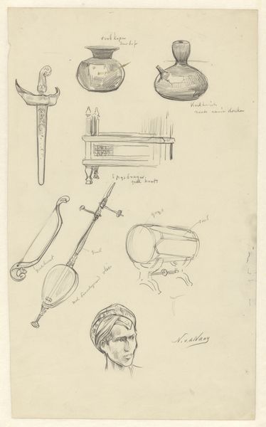 This pencil drawing, "Mannenkop en ornamenten," by Carel Adolph Lion Cachet, features a series of ornamental sketches alongside a man's profile. Dominating the composition are stylized weapon or tool handles adorned with triangular or bulbous heads. The recurrent spiral motif that terminates the handles is of particular interest. It echoes the ancient symbol of the labyrinth, representing a journey or a complex path. From the Minoan labyrinths, to medieval church floors, this symbol suggests a transformative quest. The spiral's presence here speaks to the enduring human fascination with cycles of life and death. Its persistence through millennia suggests a deep-seated psychological resonance, engaging our subconscious understanding of time and existence. Thus, the spiral in Cachet's drawing is not merely decoration, but a conduit to our collective memory, where ancient symbols continue to shape our perception and emotional experience.