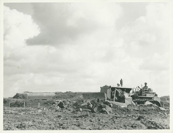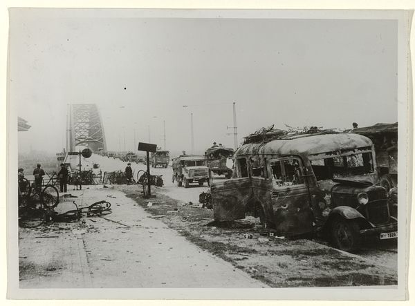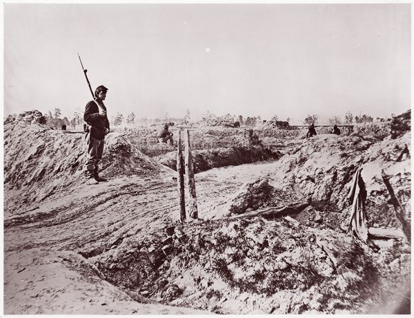 Timothy O'Sullivan captured this albumen silver print, "[Outer Line of Confederate Fortifications, in Front of Petersburg, Virginia, Captured by 18th Army Corps]" during the American Civil War. The image presents us with a stark, wide-angle view where earth tones dominate, creating a somber mood. The composition is structured by the trenches in the foreground that lead the eye towards the horizon line filled with figures and canons. O'Sullivan uses light and shadow to define the textures of the earthworks, contrasting the rough, torn surfaces of the trenches with the softer, more diffused light of the sky. Consider how O'Sullivan's choice to focus on the landscape itself becomes a powerful statement. By emphasizing the physical alterations of war, the image speaks to the deeper ideological structures at play during the conflict. It offers no heroism, just the stark reality of a landscape reshaped by division and struggle. The photograph serves as a haunting reflection on the transformation of space through conflict.