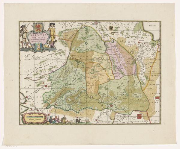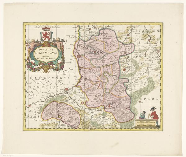 Curator: I’m immediately struck by the almost dreamlike quality of this map. It’s a blend of the factual and the fanciful, isn't it? Editor: Indeed. What we’re looking at is a Dutch Golden Age print called “Kaart van het hertogdom Limburg,” or “Map of the Duchy of Limburg,” dating from about 1628 to 1633. The artist remains anonymous. The etching and engraving techniques, with later additions of watercolor, really do create this layered, evocative impression. Curator: It definitely transcends mere topography. See how the forests almost pulse with a life of their own? And the little figure in the lower corner, meticulously drafting away – is that an allegory of precision or just a cartographer showing his work? Editor: Both, I suspect. Look closely and you'll notice symbols embedded in the heraldry— the crowned lion signifies sovereignty, while floral flourishes and human faces hint at local governance and cultural identity. The overall effect is to stake claim, define territory, perhaps even to inspire a sense of belonging in the viewer. Curator: Maps, then, become potent statements of identity and power! It's a real visual archive of history. Does the layout or some visual trick enhance that goal? Editor: Observe the subtle shift of perspectives; at points, the terrain seems almost tilted towards the viewer. Roads converge, forests invite—these could evoke specific journeys, personal encounters, making this abstracted duchy remarkably tangible. What does the artwork "tell" you, not about land, but culture? Curator: I hear an unspoken confidence and ingenuity of humankind! From the initial lines etched to capture landscape details to adding the very last watercolors for artistic finesse—it suggests a complete understanding of the area by someone very involved. I am just left wondering how many stories are hidden in these hand-drawn borders. Editor: And perhaps that's the lasting power of this print—to pique curiosity. What I see here is far more than a means of getting from one village to another, and rather a celebration of place and a people who call that territory home.