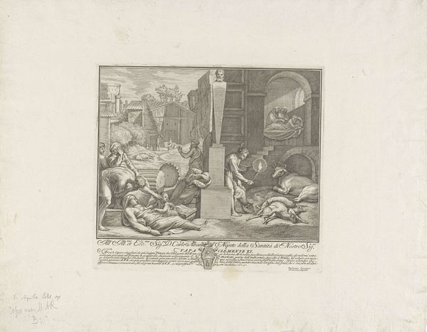 Simon Fokke’s etching, "Plundering van een huis tijdens de Spaanse Furie, 1576," captures a scene of violence with precise lines and stark contrasts. The composition is carefully structured to convey chaos and tension. The foreground is filled with bodies, overturned objects, and frantic figures engaged in combat, creating a sense of immediate disruption. The lines are sharp and detailed, contributing to the overall sense of turmoil. Light and shadow are used to highlight the dramatic action, drawing the viewer's eye to the central struggle. The architectural elements, like the window and doorway, frame the scene and add depth, offering glimpses of the wider devastation outside. Here, Fokke uses the etching medium to explore themes of violence, power, and social breakdown. The artwork challenges viewers to confront the brutal realities of historical conflict and reflect on the fragility of order. Ultimately, it serves as a testament to the power of art to bear witness and provoke contemplation.