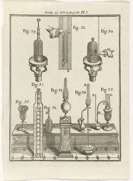 This engraving by Nicolaas van Frankendaal presents an array of physics instruments, objects that speak to the Enlightenment's quest to understand the natural world through reason and empirical observation. Consider the glass jar, reminiscent of alchemical vessels, yet here it is employed for experiments. The sphere on the table with a hand upon it – this is an instrument not just of physics but of theater. The hand reminds us that experiments were public events, demonstrations of nature's hidden forces made visible. The motif of the hand is ancient, a symbol of power and control, yet here it is subservient to the workings of the machine. Observe how the hand reappears, transformed, in religious art, bestowing blessings, a gesture of divine authority, or in scenes of labor. The hand, through centuries, symbolizes human endeavor, skill, and connection, all in the service of enlightenment and understanding.