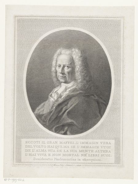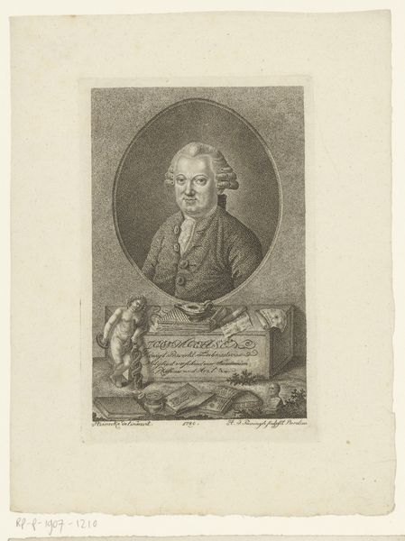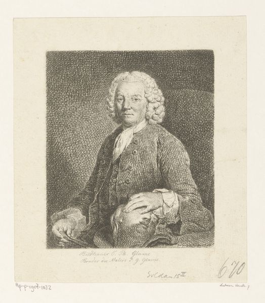 Editor: This is a print titled "Portret van Johann Georg Glume, vader van de kunstenaar" made in 1748 by Johann Gottlieb Glume. It's an engraving, and it feels incredibly formal and precise. What strikes you most about its composition? Curator: The immediate point of entry for me is the masterful deployment of line. Observe the density and variation; the hatching used to articulate form, volume, and the fall of light across the figure’s face and clothing. Ask yourself: what effect does this emphasis on line, as opposed to tonal gradations, create? Editor: It does make the figure appear very defined and almost stoic. Is that intentional, perhaps linked to Baroque portraiture styles? Curator: Indeed. Baroque portraiture frequently used established visual vocabularies to communicate power and status. Consider how the linearity contributes to a sense of rigidity, of controlled presentation. Also, think about the surface texture; how does the medium of engraving—the physical act of incising lines into a metal plate—impact your reading of the portrait's subject? Editor: That’s a good point; engraving does feel more permanent than, say, charcoal. I guess that reinforces the subject’s importance, being captured so definitively. Curator: Precisely. Now consider the internal relationships within the work: the interplay between light and shadow, the angles of the cane. Are there any oppositions that become significant for you? Editor: The crisp details versus the almost hazy background is really interesting; one suggests importance, the other feels secondary. I hadn’t really thought about it like that. Curator: Close observation brings its own rewards. Formal elements aren't simply aesthetic choices; they actively shape meaning. Editor: I'll definitely be paying more attention to line from now on. Thanks!