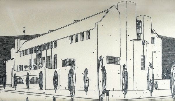 Curator: This is a drawing from 1932, "Decoration Sketch for the play 'Joy Street'", by Petre Otskheli. It's crafted with ink on paper, presenting what looks like a rather somber city scene. Editor: Somber is right. There's a starkness to the architectural drawing, a kind of alienated feeling I get immediately. All those repetitive windows… it almost feels oppressive. Curator: Otskheli was working during the Soviet era in Georgia. This piece is categorized within the Soviet Nonconformist Art movement. He was designing theater sets. It’s fascinating how stage design became an avenue for subtle resistance and commentary, reflecting a sense of disillusionment within the restrictions imposed. Editor: Exactly. Looking at this from an intersectional perspective, we can think about how urban spaces, especially within totalitarian regimes, impacted individual identities and creativity. That stark facade becomes symbolic. Also the street lamps hanging heavily… what's on 'Joy Street' doesn't look particularly joyful, does it? Curator: The title is deeply ironic considering the artistic climate. The scene presents an austere view of modernity, playing perhaps with notions of public façade versus private reality, and mirroring anxieties related to societal control. The art deco influences, while present, feel deliberately subdued. Editor: Subdued, yes, like joy is being rationed. Even the placement of that ‘Bar’ sign; its stylization almost mocks the idea of a carefree night out. This era saw many grappling with disillusionment after failed promises. Artists, often at the forefront of challenging such orthodoxies, used what was accessible - even something as apparently benign as stage design – as a form of cultural activism. Curator: Ultimately, the sketch gives us access into not just an artistic idea for theater, but how that stage might serve as commentary. Editor: Precisely, the deceptive simplicity of the piece allows us a complex discourse on the lived experience of that time. Curator: Yes. And the artist can engage in it indirectly.