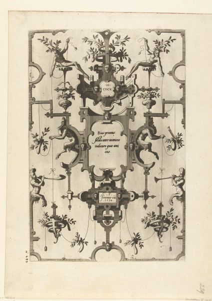 Johann Adam Delsenbach created this print, "Grotesken met Diana en gevleugelde vrouwfiguur," sometime between the late 17th and early 18th centuries. It showcases the grotesque style, popular during the Baroque era, characterized by elaborate, fantastical ornamentation. This style emerged in a Europe steeped in rigid social hierarchies, with the aristocracy using art to reinforce their power and status. Yet, within the intricate details of Delsenbach’s print, we see an interesting blend of classical and mythological figures with more earthly, sensual forms. Diana, the Roman goddess of the hunt, for example, is juxtaposed with winged female figures, blurring the lines between the sacred and the profane. Notice how the grotesque style often incorporates asymmetry and the unexpected, challenging traditional notions of beauty and order. This print hints at the cultural tensions of the time, when artists navigated expectations for decorum while expressing creative freedom. Delsenbach's fusion of classical motifs with more whimsical elements creates a visually complex image.