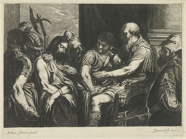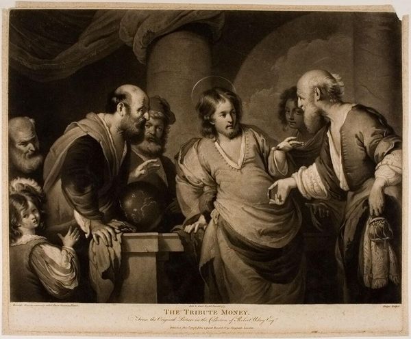 Christus in debat met Farizeeën, or Christ debating with Pharisees, is a print made by Charles Howard Hodges. Hodges, born in London, eventually moved to the Netherlands, finding success as a portrait painter. This piece depicts a biblical scene where a young Jesus engages in a theological debate with the Pharisees. Consider the historical context: Hodges was working during a time of significant social and political upheaval, with shifting attitudes towards religion and authority. The image portrays Jesus as a figure of youthful wisdom challenging established norms. It speaks to the power dynamics between the marginalized and the powerful.