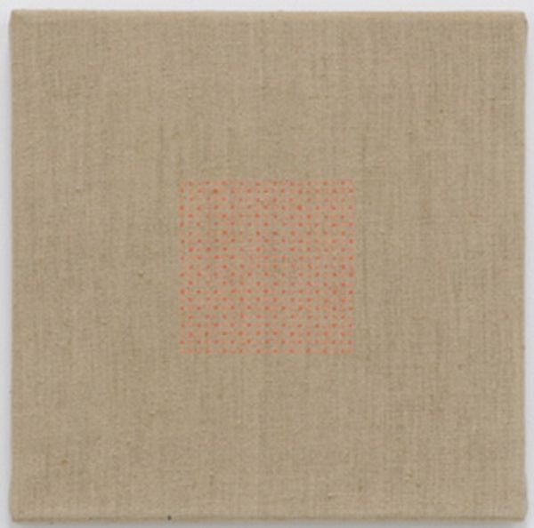 Agnes Martin made this painting, "The Islands," using acrylic and graphite on canvas. The way she’s made these tiny marks, all in a grid, speaks to her approach as a kind of meditative process. Look at the surface – it’s so subtle, almost like a whisper. She’s got these really thin washes of paint, where you can still see the tooth of the canvas. Then, those little dots, like tiny islands floating in a sea of beige. I love how she creates this quiet rhythm with just a few simple elements. There’s one faint horizontal line about a third of the way down. It’s barely there, but it anchors the whole thing. Martin reminds me a bit of Sol LeWitt, but where he's all about the system, she’s all about the feeling. It’s not about perfection, but about the humanness, the imperfections. And that’s what makes it so beautiful.